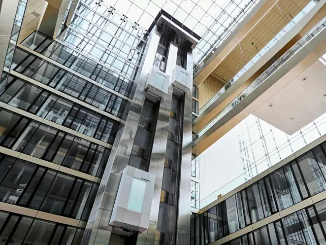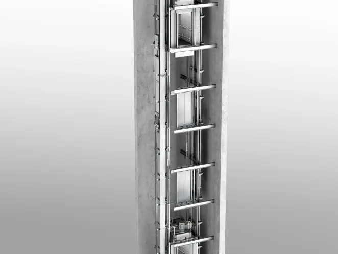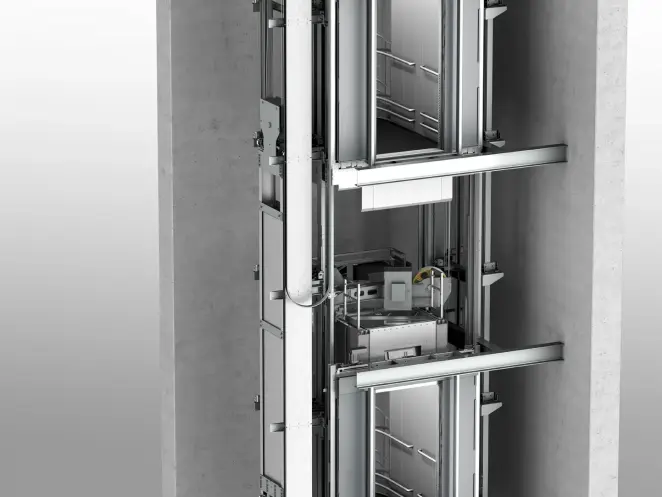 Two elevator cars share the same hoistway, landing doors and guide rails, saving substantial money in construction labour and materials as well as maintenance.